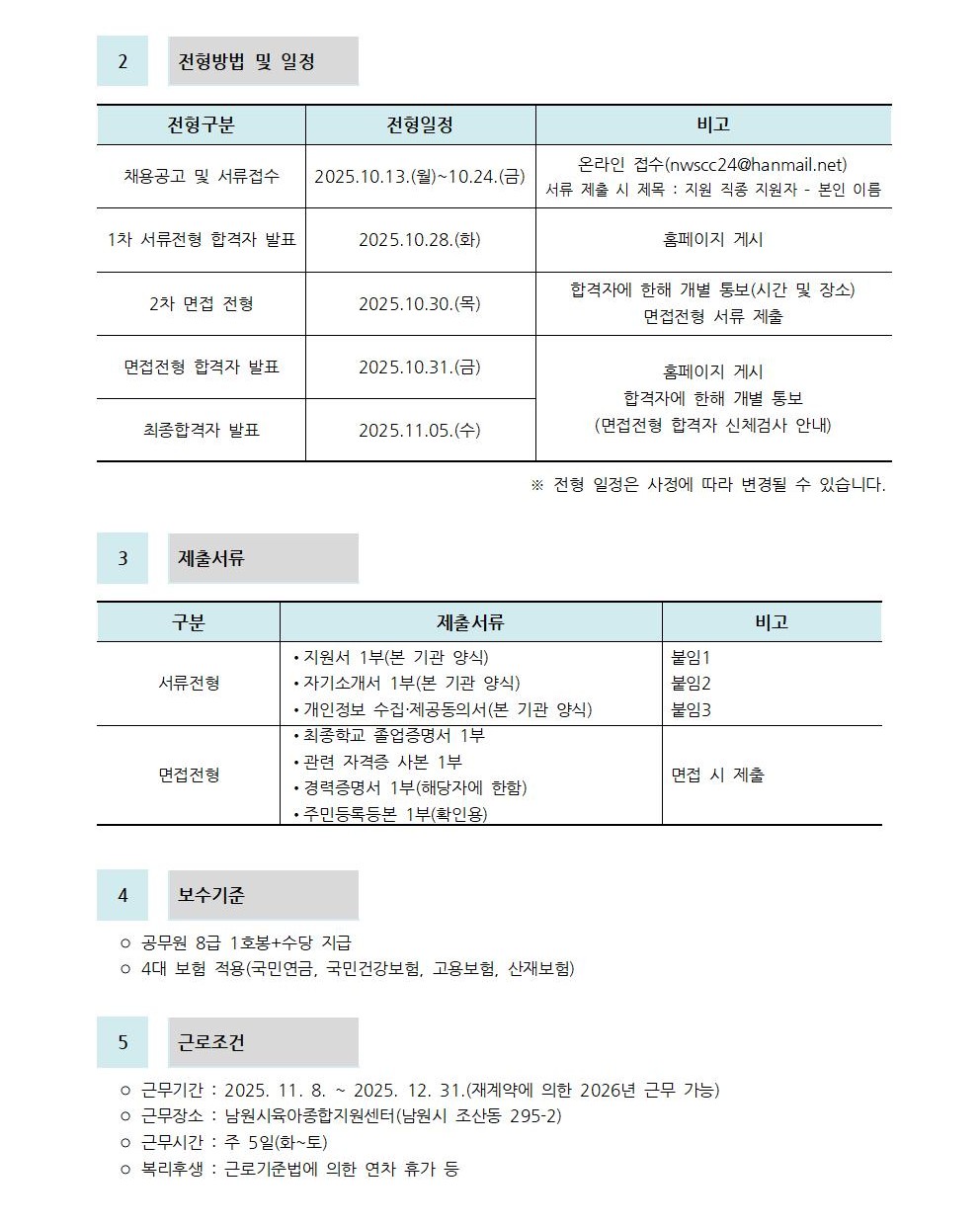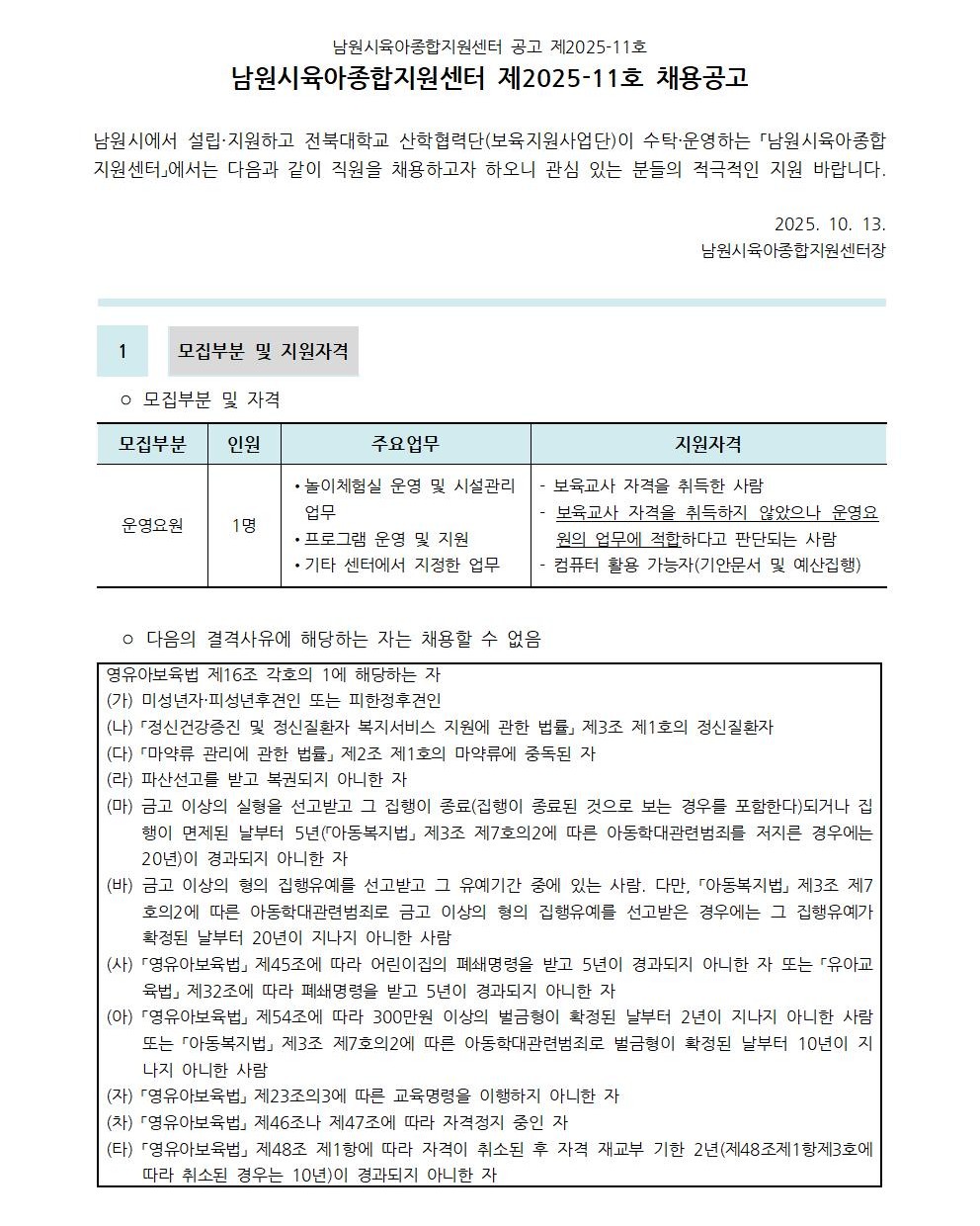 [채용] 제2025-11호 남원시육아종합지원센터 직원채용 공고