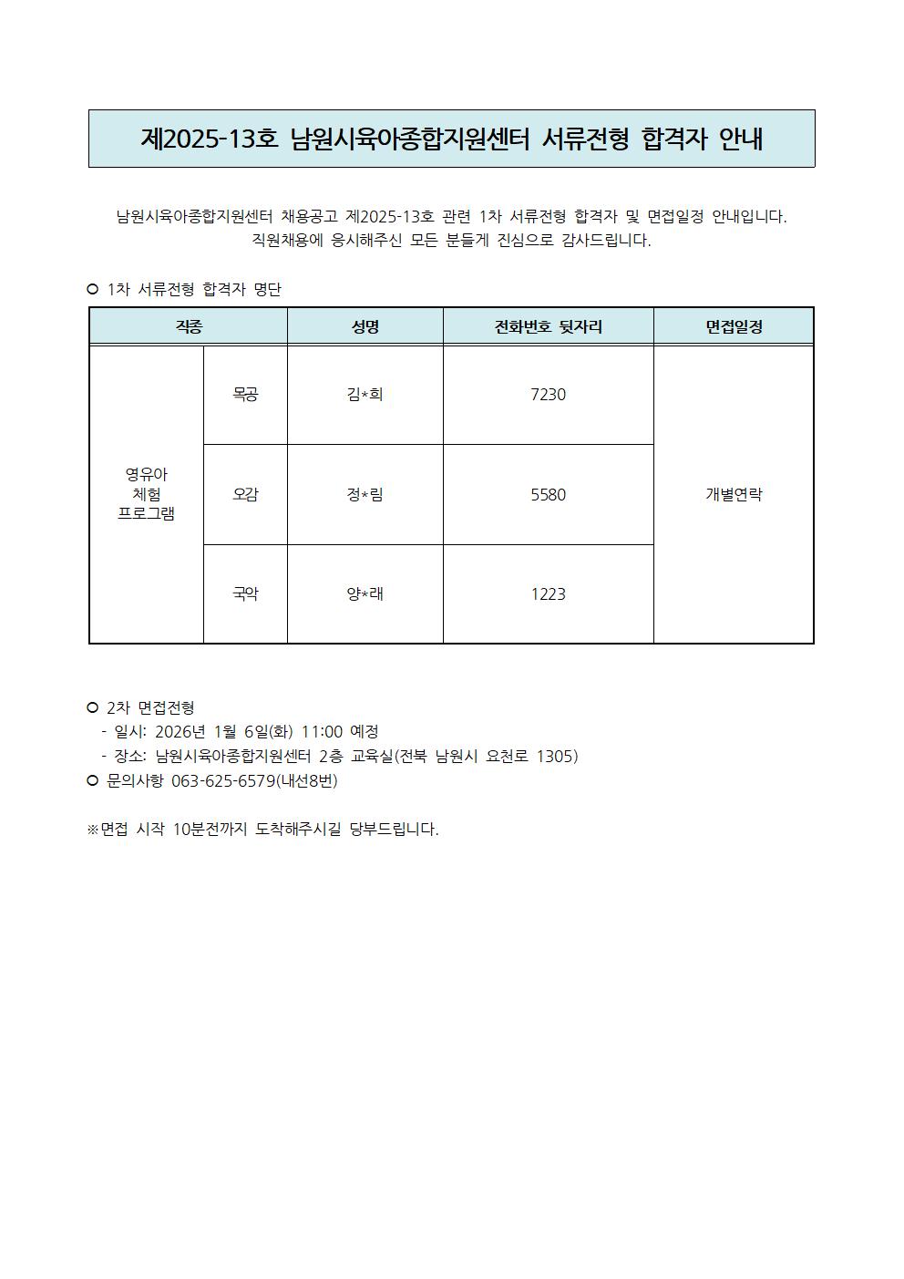 [채용] 제2025-13호 남원시육아종합지원센터 서류전형 합격자 안내