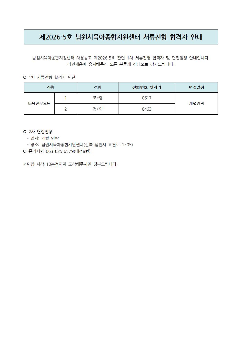 [채용] 제2026-5호 남원시육아종합지원센터 서류전형 합격자 안내
