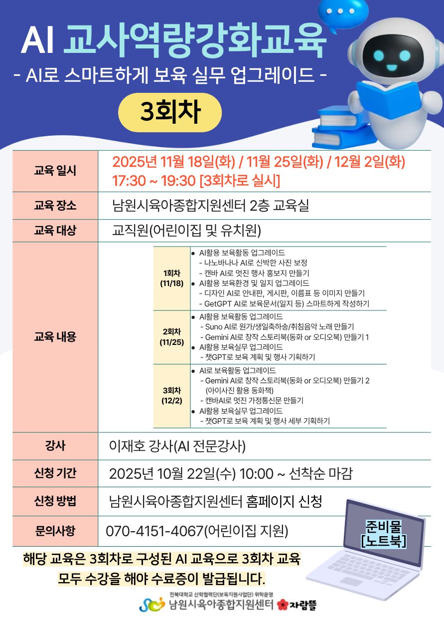 [안내] [교사교육] AI 교사역량강화교육(AI로 스마트하게 보육실무 업그레이드) 3회차 신청안내