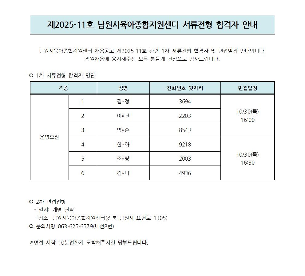 [채용] 제2025-11호 남원시육아종합지원센터 서류전형 합격자 안내