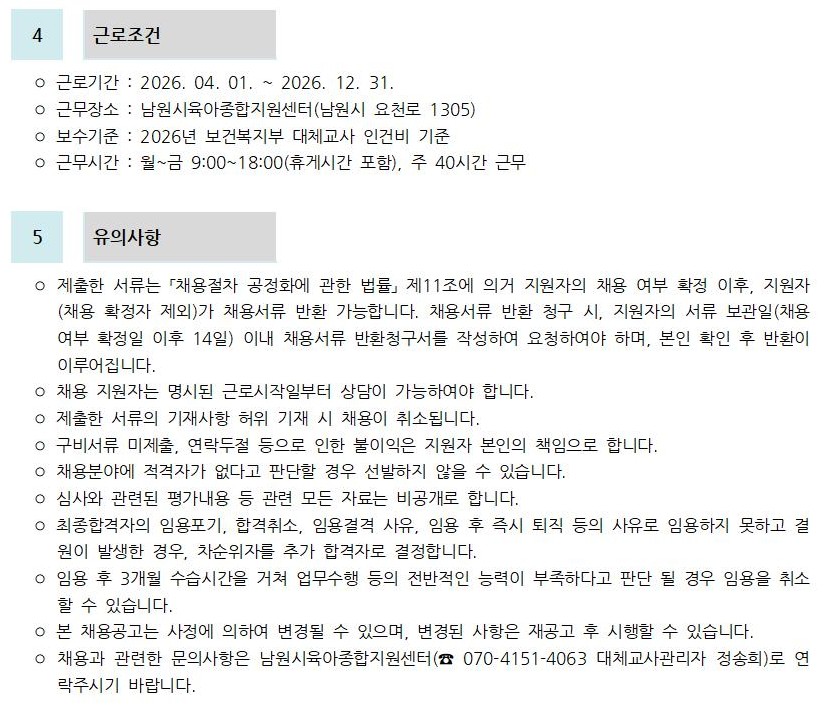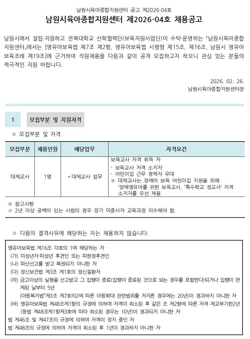 [안내] 제2026-4호 남원시육아종합지원센터 대체교사 채용 공고