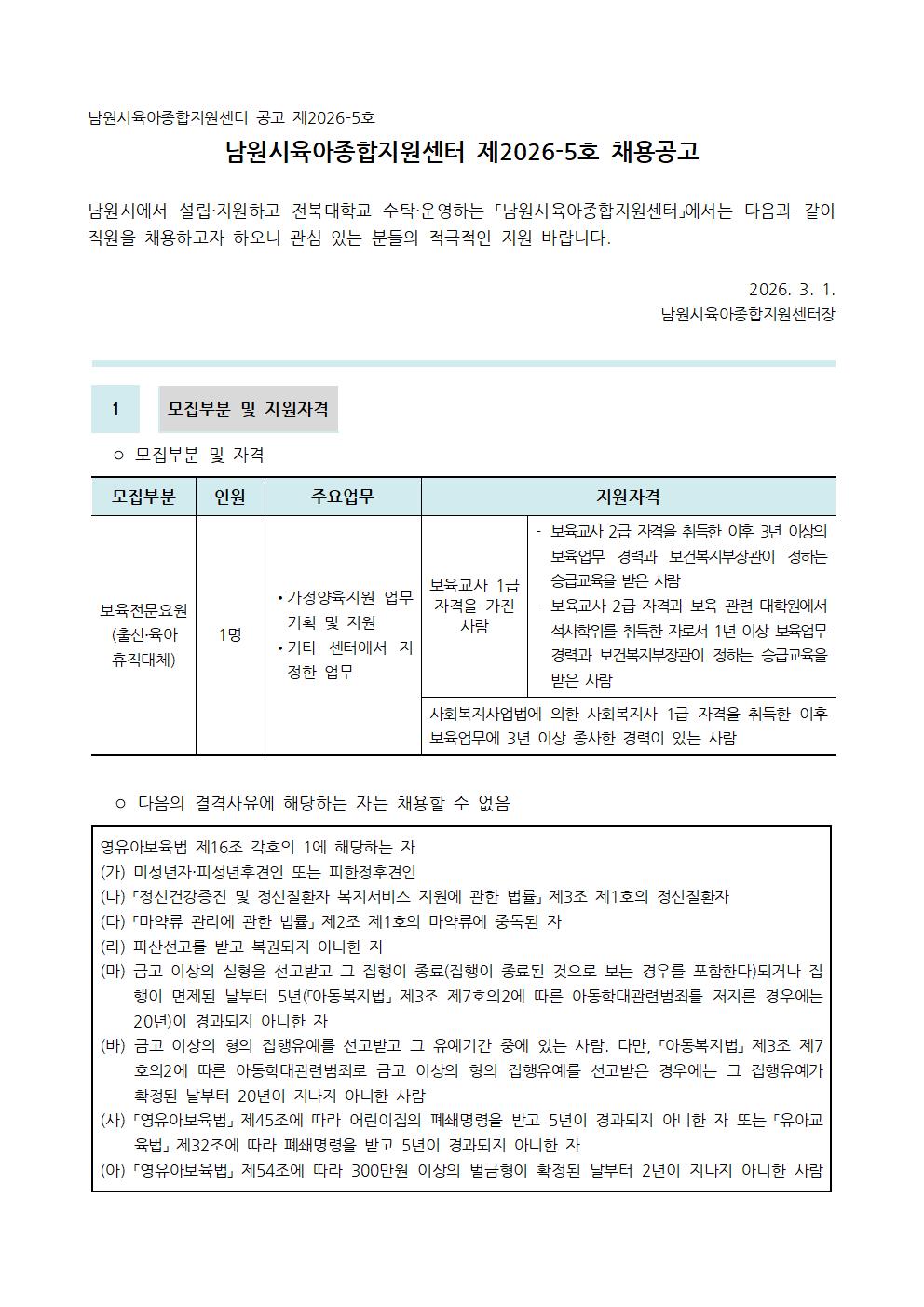 제2026-4호 남원시육아종합지원센터 대체교사 채용 공고