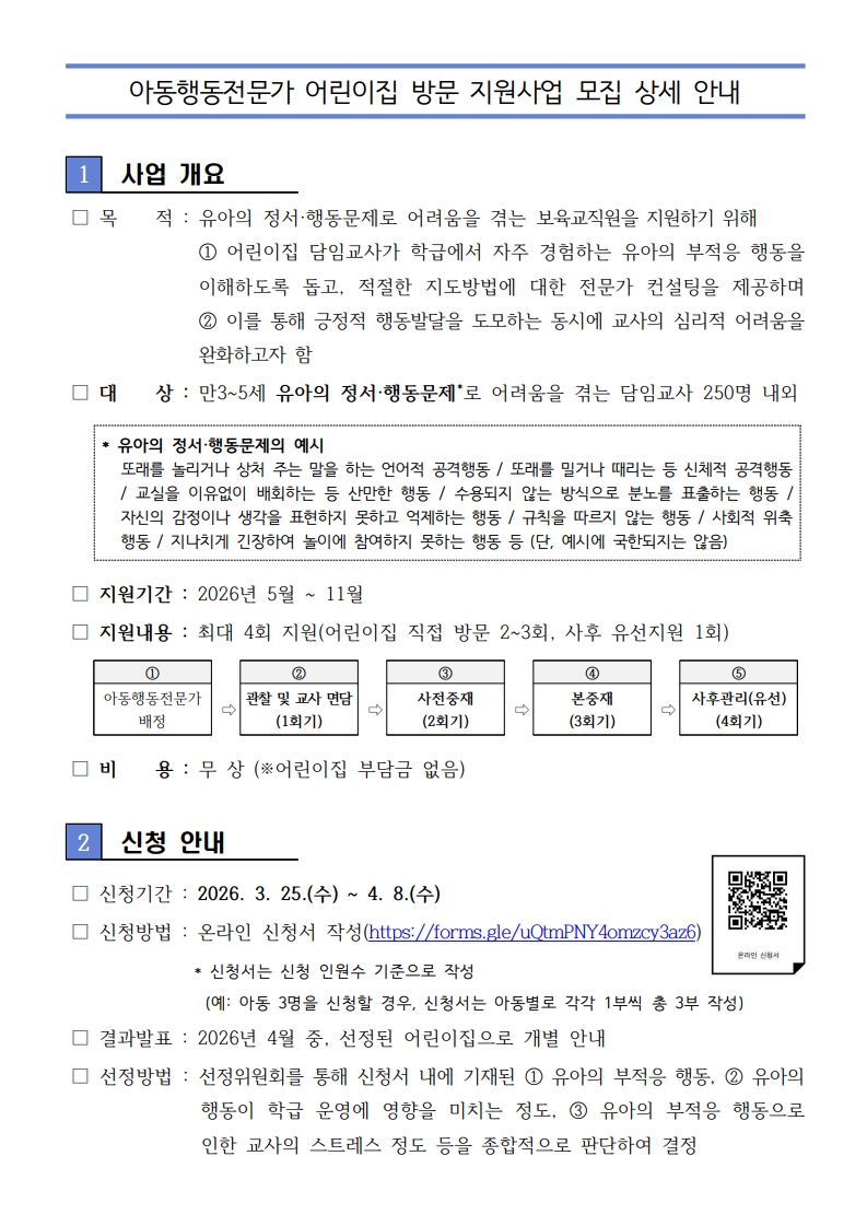 [안내] 2026년 아동행동전문가 어린이집 방문 지원사업 참여 어린이집 모집 안내