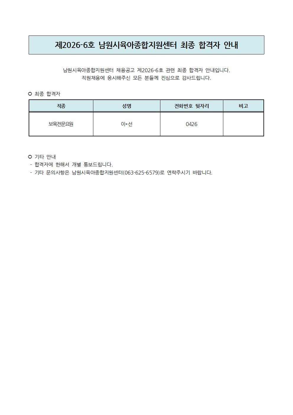 [채용] 제2026-6호 남원시육아종합지원센터 최종 합격자 안내