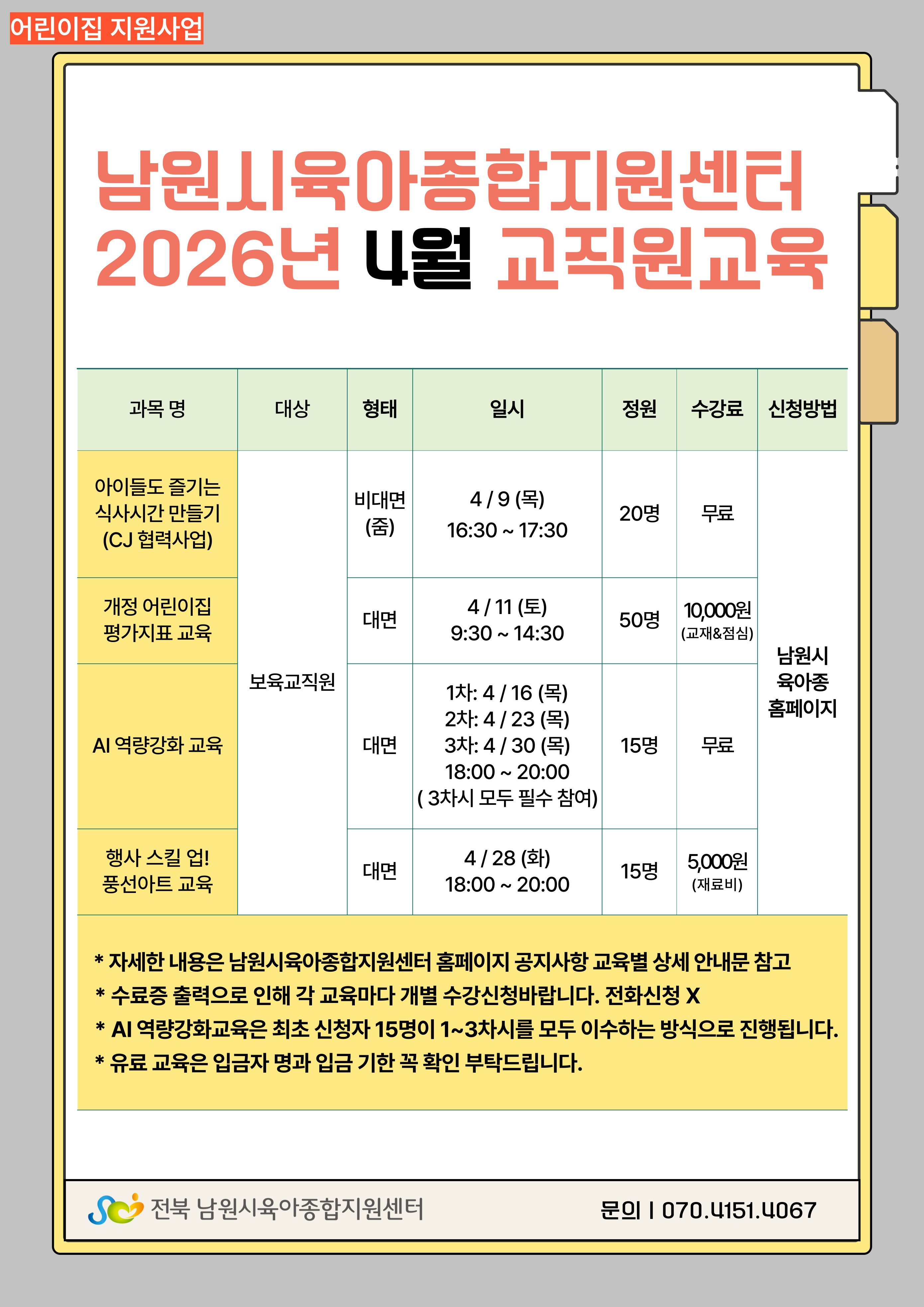 제2026-4호 남원시육아종합지원센터 <대체교사> 서류전형 합격자 안내