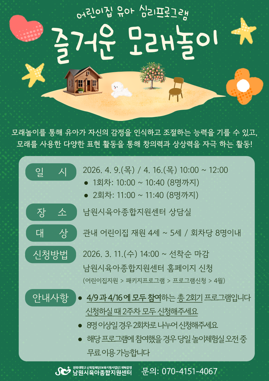 | [기타] 즐거운 모래놀이 (4/16 2회차) / 4/9 프로그램을 신청해야 신청 가능, 총 2주차 프로그램 | |