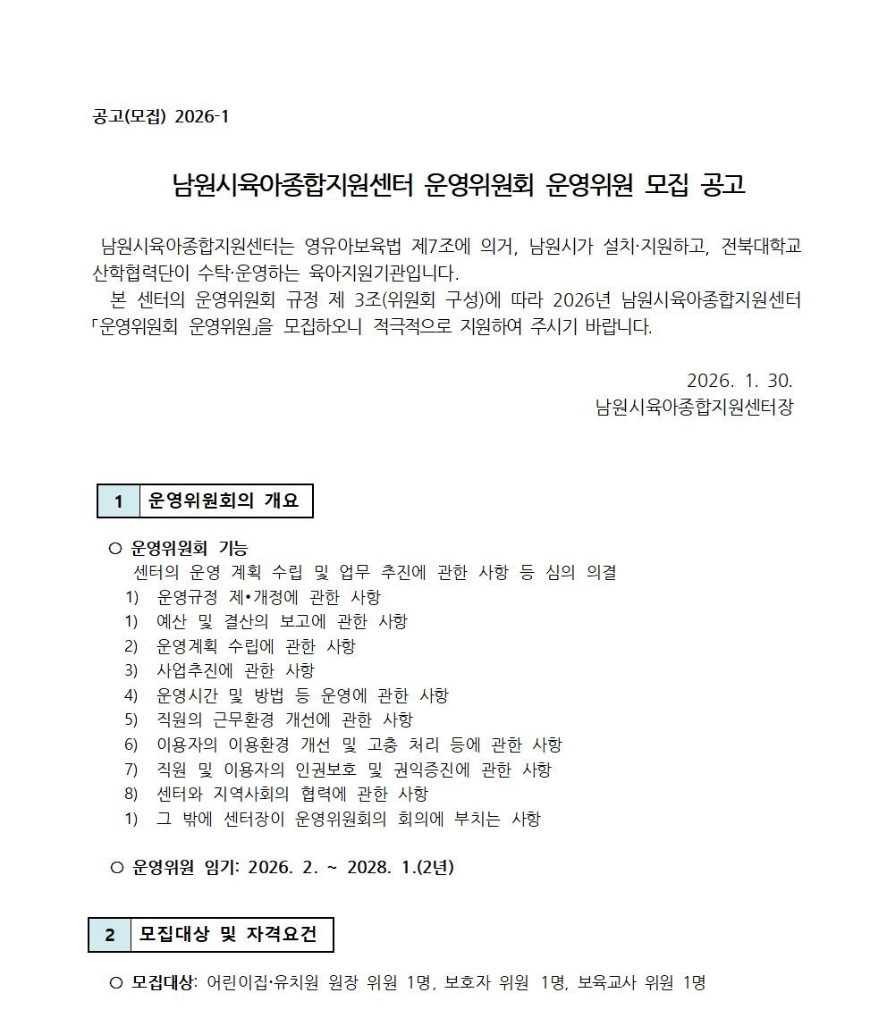 [운영위원회] 2026년 남원시육아종합지원센터 운영위원회 운영위원 모집 공고