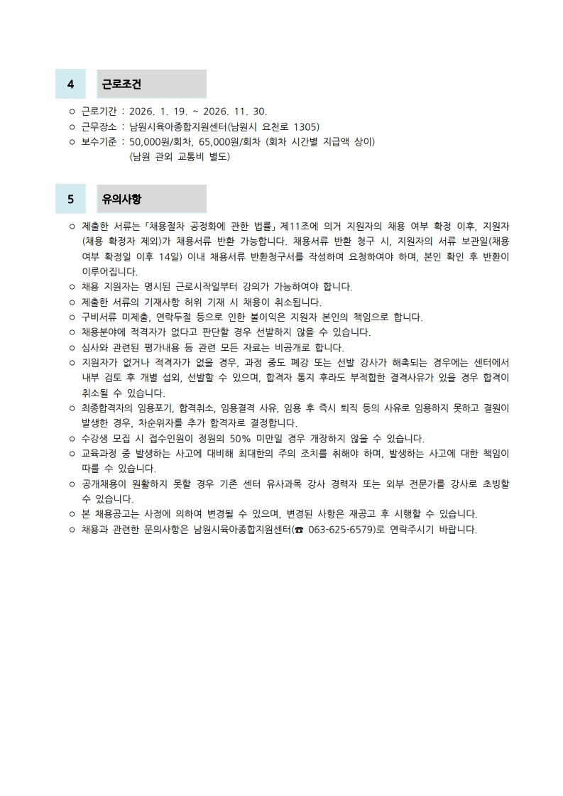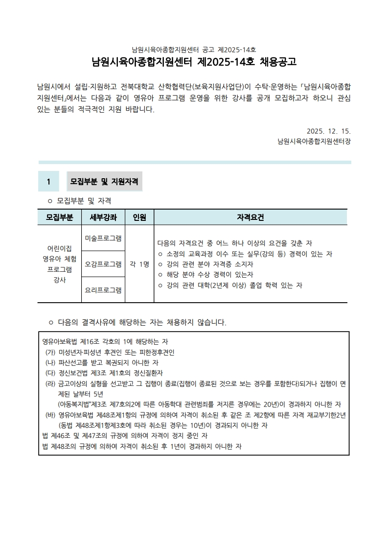 제2025-15호 남원시육아종합지원센터 직원채용 공고