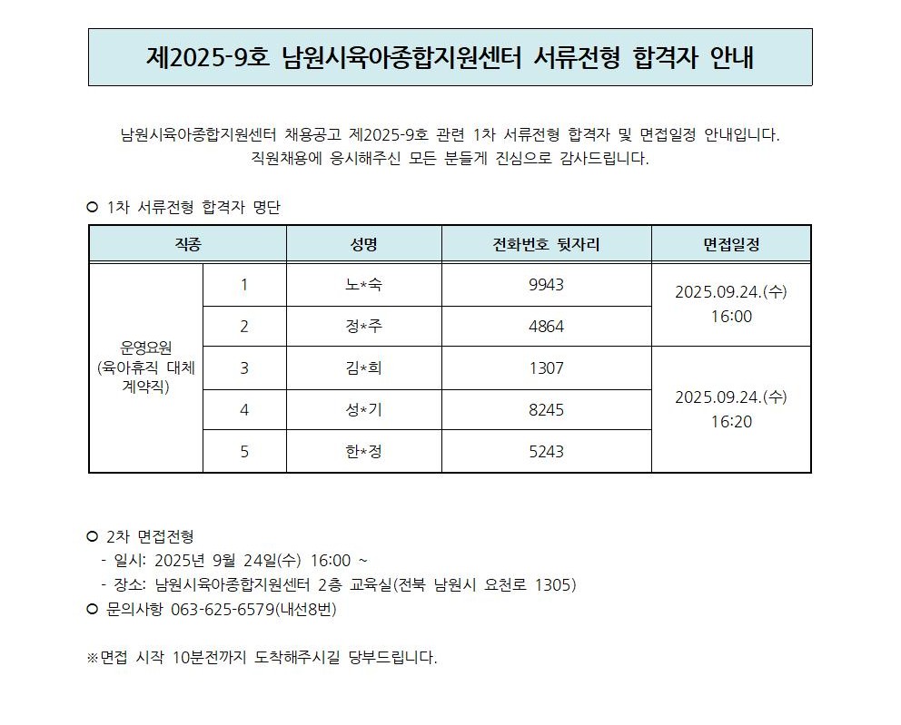 제2025-8호 남원시육아종합지원센터 서류전형 합격자 안내