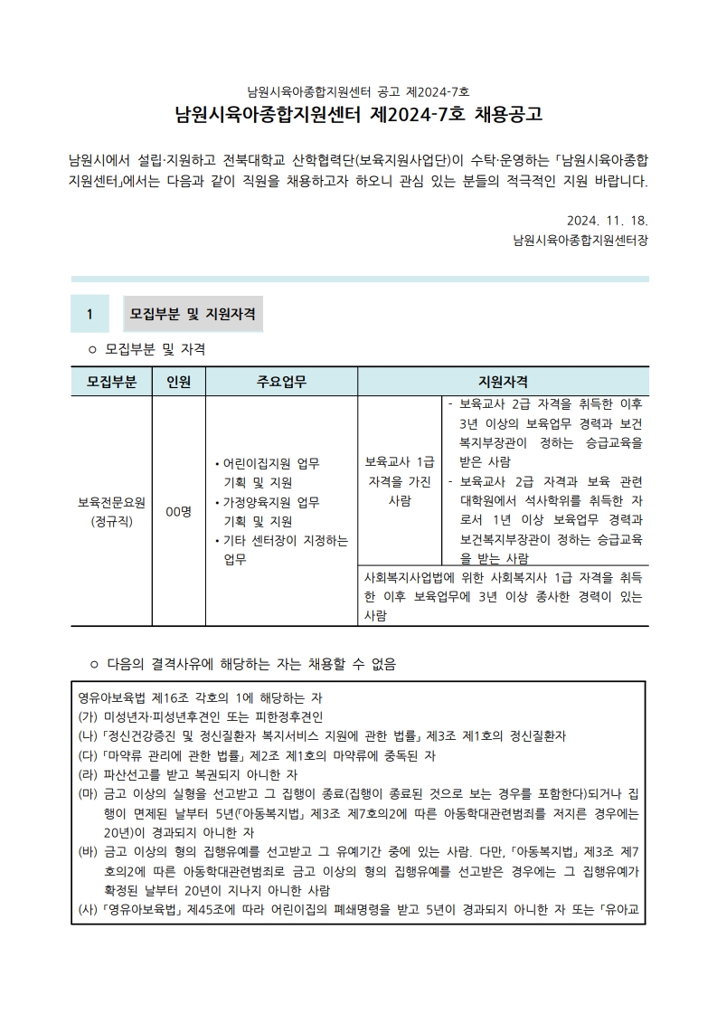 [채용] 제2024-7호 남원시육아종합지원센터 직원채용 공고