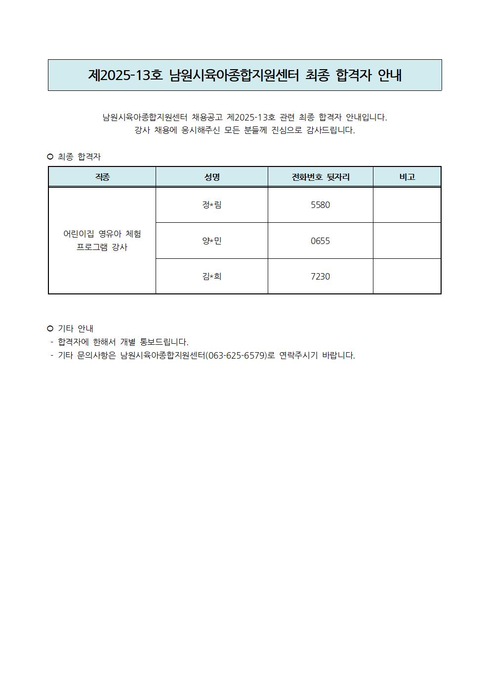 [안내] 제2025-13호 남원시육아종합지원센터 최종합격자 안내