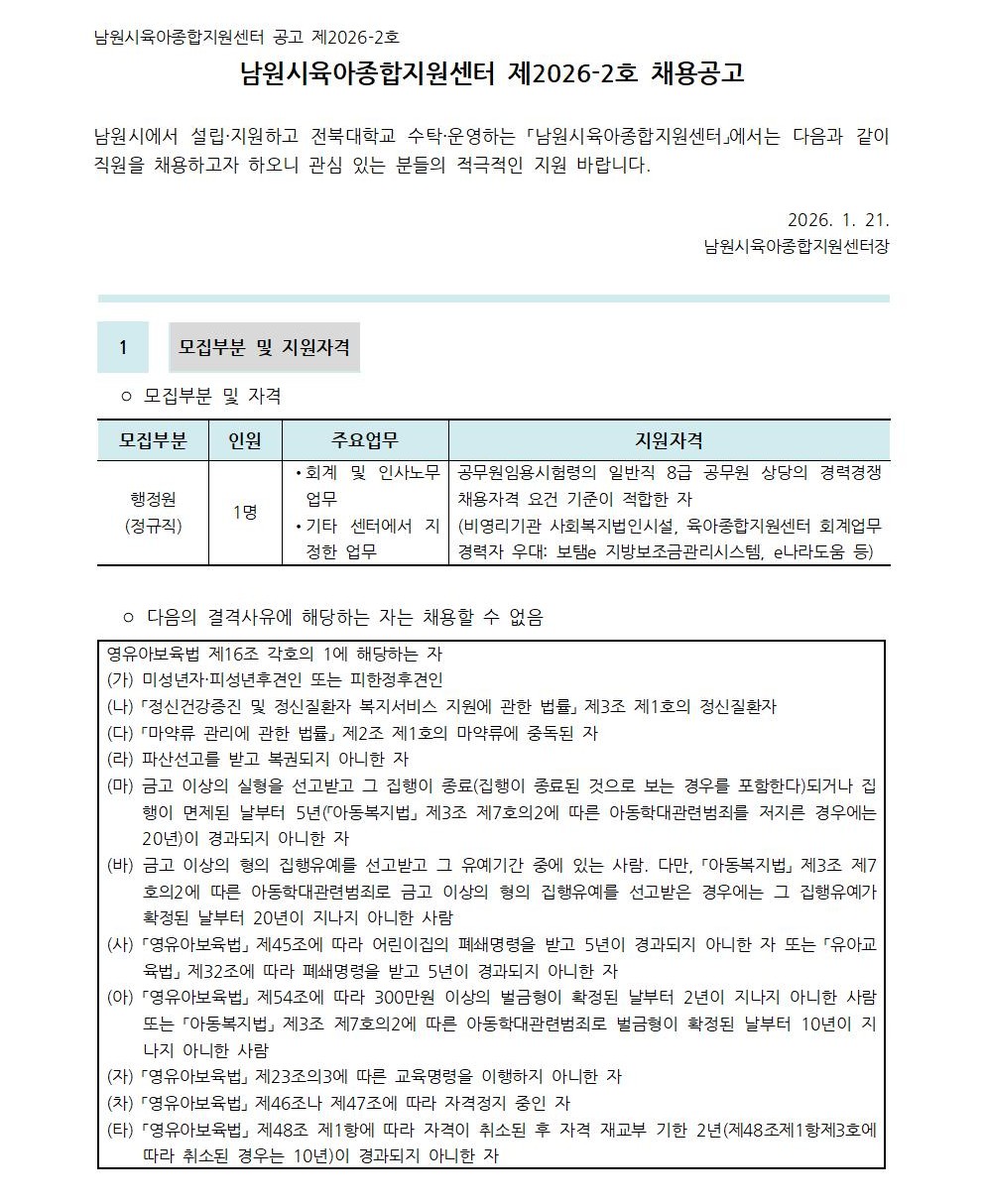 [채용] 제2026-2호 남원시육아종합지원센터 직원채용 공고
