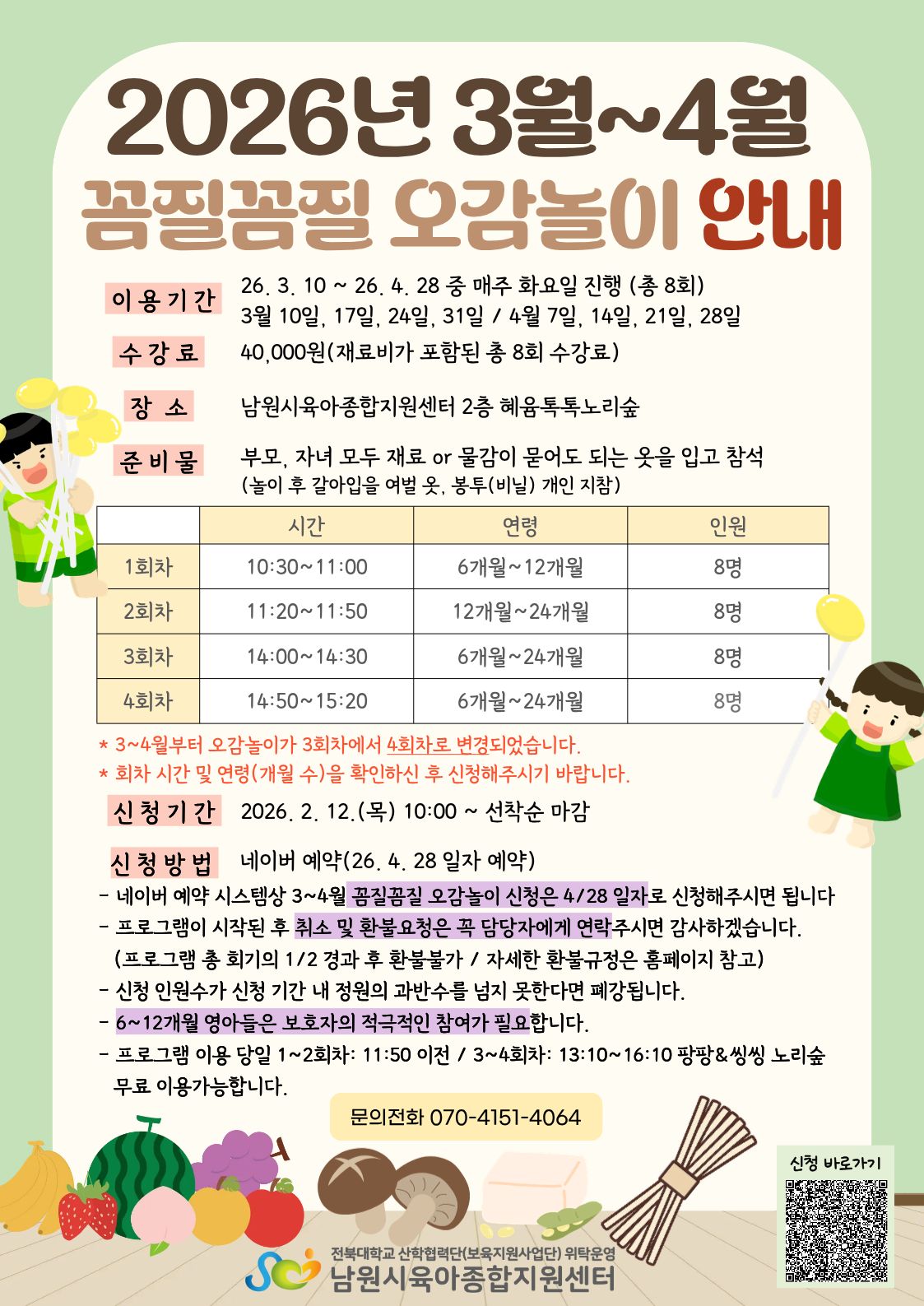 [안내] [영유아체험프로그램] 꼼질꼼질 오감놀이 3월~4월 신청안내