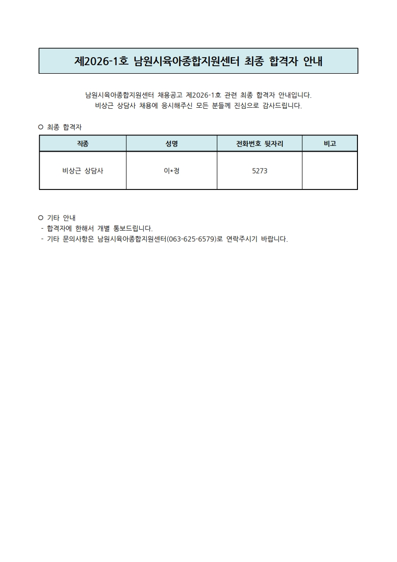 [채용] 제2026-1호 남원시육아종합지원센터 최종합격자 안내
