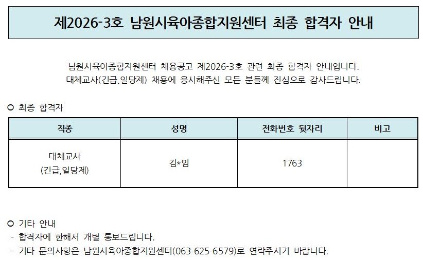 [안내] 제2026-3호 남원시육아종합지원센터 최종합격자 안내